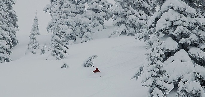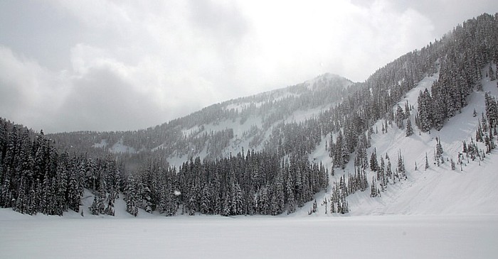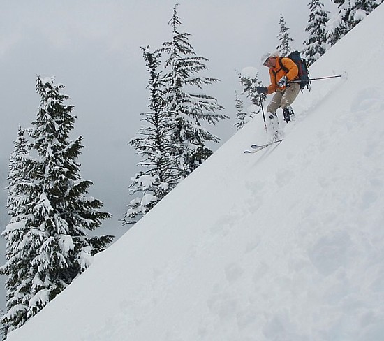 From the North end of the summit ridge, we skied down toward a no-name lake on 1' powder (~1500'), then did a short skin up another ridge looking down Pratt Lake. A short (~900) but fairly steep open slope brought us straight down to the lake. The snow was a bit heavier, but very consistent allowing some fast wide turns.