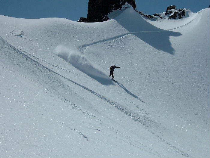 We followed the track on Stevens Canyon Road to the lake and up to the Castle. We saw only one other person (a split boarded named Dave) in the range all day and only Amar and company's tracks over on Castle so we felt like we had the place all to ourselves. We first skied about 800vf of fine quality corn down the south side of Pinnacle. We followed that with 1150vf of quality powder skiing from Plummer Peak west down to Cliff Lake. We then climbed up the western flank of Denman and descended to the Lane-Denman saddle and down the Lane Chute in excellent powder conditions all the way to Tatoosh Creek for another 1500vf. Beautiful blue skies, moderate temps, very light winds, and a rare combination of quality corn and powder made for an epic day.