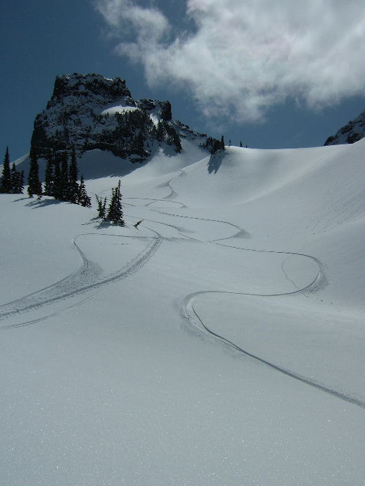 Went up Tatoosh today as well and know we made the best call. Was a perfect day and the North facing slopes still held powder, even in the sun 8). Bluebird, warm, and great riding all the way down to Reflection Lk. Thanks to all who laid in the track the last couple of days; off trail still deep, esp. below the trees. The only crust was in the morning going up the Narada face and by afternoon had turned nice and soft. Fun, Fun, Fun ;D.