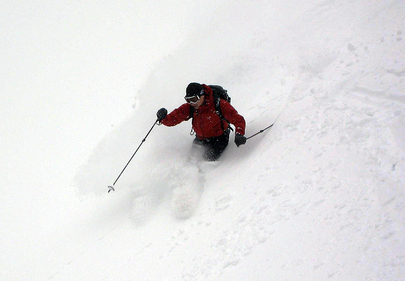 Got a late start after a late night at work and approached Kendall Peak from the south through Commonwealth Basin. Still no problem with the two stream crossings. We were expecting an inch or two on hard frozen corn, but instead it looked like this