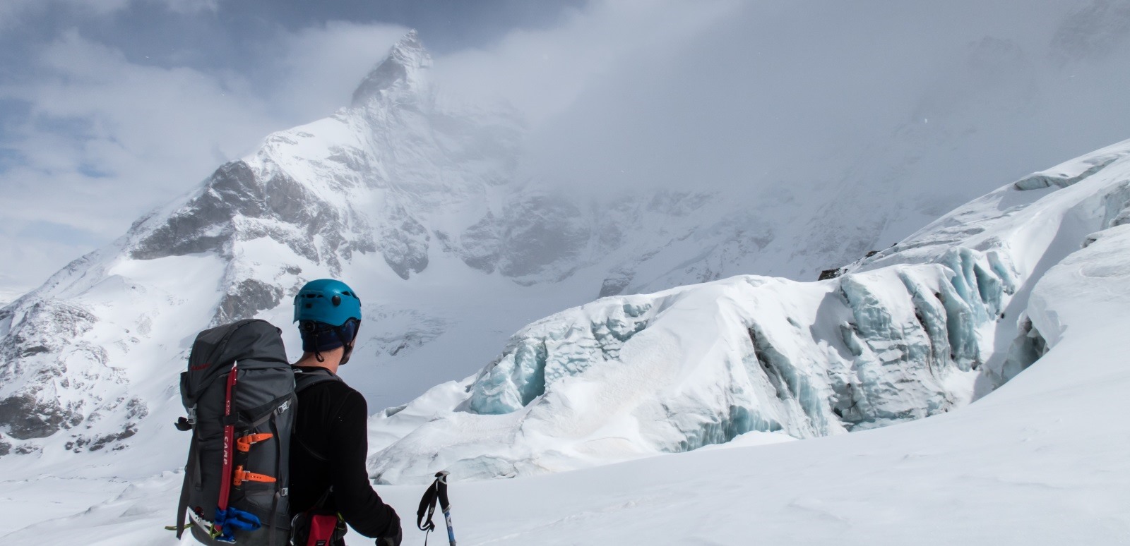 Day 5: Vignettes to Zermatt: The Vignettes hut is pretty awesome, perched on a ridge, with tunnels that have human sized windows that let you look down thousands of feet onto the glaciers below. There is also a heli pad right next to the hut. The pad is so close to the kitchen window that I would call it a heli drive through. By the time we got to the hut the day before, the weather was so bad, that I figured we were done. We probably had to ski back down to Arolla and skip the last part of the leg going into Zermatt. The big concern was the ski down into Zermatt as the last part has a few ice falls that need to be avoided and could be hazardous in whiteout conditions. At dinner we were assigned to a table that had a very optimistic trip leader. His plan was to do the first half of the leg which is mostly easy ascending and going across relatively flat glaciers and make the call at the col de Valpelline (3550m). At any point it would be easy and reasonable to reverse and ski one of the routes back down to Arolla or stop at one of the refugees along the way, or possibly reverse to the Cabannes des Vignettes. We liked that plan, but the next morning the conditions were the worst of all. Going over the Col de lEveque we got blasted, visibility was at 100ft or less, guided groups were gone, and everybody else went back to the hut except the group sharing the dinner table with us. We eventually caught up to them at the col du Mt Brullee where they threw in the towel. Given the early time, many exist strategies available, we pushed on across the flat part of the Tsa Tsa glacier, climbing up to the Col de Valpelline. At the col de Valpelline, our high point for the day, things got worse again, we popped over, and boom, it cleared out just below us and we could see all the way to Zermatt. Jackpot. At this point we made it. We quickly skied down before we lost the window of opportunity, but once we got below 2900m we were home free. We also got a nice surprise when the Matterhorn showed itself.