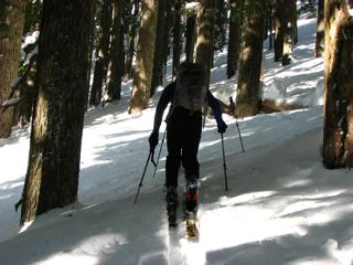 We arrived at the park around 8:30AM, finding the Longmire gate already open at that time. A small bit of climbing was needed to gain the snow slope from the parking lot at the Christine Falls parking area (there is lot of snow there). We opted to follow the Burgdorfer's alternate route up to Van Trump Park rather than going up by the main route that takes you below Comet falls. We found really easy skinning in the trees heading up to the ridge on soft snow in beautiful light with the sun breaking through in spots. After gaining the ridge at around 4700 feet, we continued skinning up to Van Trump Park, eventually breaking out of the trees about 2 hours after starting. We were initially excited as the snow in the clearing was nice and soft, but as soon as we continued further up the ridge past Mildred point it got very wet and heavy as temps warmed up very quickly in all the heavy sun exposure. By the time the terrain unfolded to us more and we realized the better, safer slopes lay across Van Trump Creek on the other ridge, we couldn't find any slopes we felt were safe for descending into and then crossing the valley. Lots of wet, heavy snow on steepish slopes and plenty of sloughs being seen all around us. We worked our way up to about 6200 feet on the ridge eventually running into an obstacle we didn't feel was safe in the warming conditions and eventually opting to head back down. We found lots of wet, heavy snow and occasional pockets of soft powder in the shade.