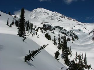 Jim (JimH), Chris (CMS) and I decided to take advantage of the nice forecast today and head out to Mt. Rainier. After a lot of debate about where to go, we opted to head up to Van Trump Park looking for some nice open slopes and some great turns. We found plenty of the former... with lots of mushy snow... and little of the latter.