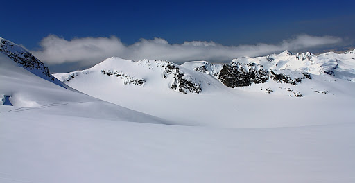 Pete and I took advantage of the high pressure and a day off from work on Friday/Saturday to ski the Spearhead Traverse (my first time, Petes second). We didnt actually decide to pull the trigger on it until Thursday at 8:30pm so we were relegated to an EARLY start on Friday to get up there in time, but that just adds to the adventure¦right? We pulled out of our driveway at 3:30am on Friday and rolled into Whistler village just before 8am. We were on the lifts by 9am and exiting the Blackcomb ski area by 10. There was a steady stream of folks out in front of us so we knew it would not be a solitary experience, but there was a delightful highway already laid out, so we certainly didnt mind.