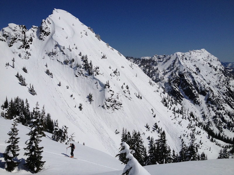 Aiming to capitalize on the good weather Nathan and I headed up to Snoqualmie pass to explore the Commonwealth basin. We are both relatively new to the area so we set the goal of exploring the basin and seeing if we could find something safe to ski. Skis and skins went on at the road. We followed ski and snowshoe tracks loosely and stayed far right of the creek, skirting around the western side of Kendall. Lots of recent wet slide activity on most slopes. We arrived at the base of Red Mountain and began a traverse up towards the western slope. Recent slide debris, warm temps, and heavy wet snow deterred us from continuing up Red, so we decided to cautiously ski down to the small lake between Red Mountain and Lundin Peak. We decided to ascend and ski the eastern aspect of Lundin Peak. A quick skin and we arrived at the top of the sub-peak. A cautious descent closely followed our uphill track. As we neared the base of Lundin we set in motion a couple small and slow wet slush slides. Heavy wet snow and momentum caused these slides to carry surprisingly far. We observed minimal active pinwheeling and no natural slide activity today. However lots of recent activity and warm temperatures as we turn the corner to true consolidation of the snowpack. Heavy wet snow makes for interesting skiing! Beautiful weather, but in regard to snow quality it is definitely volcano season... Bring on the corn!