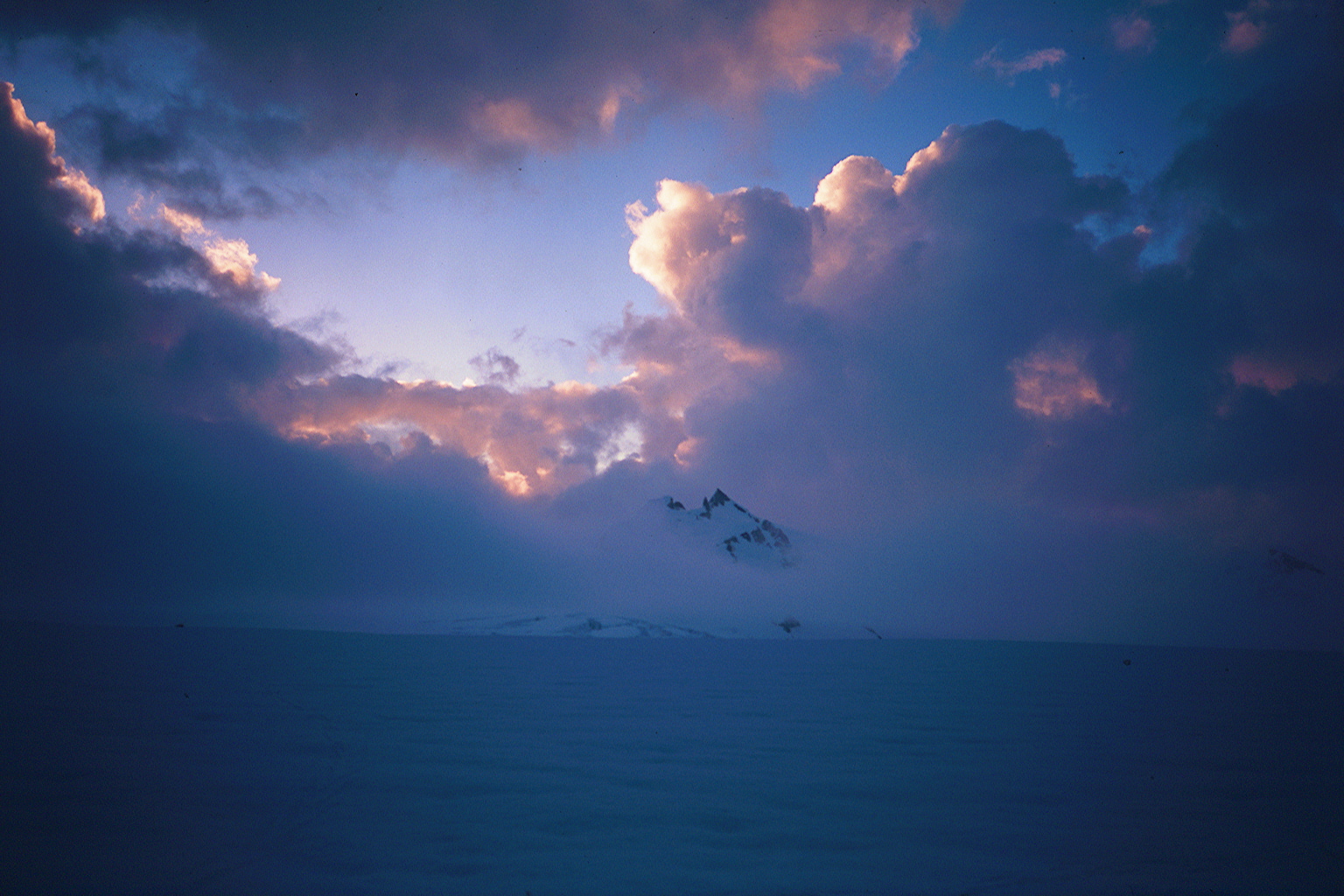 Just as my girlfriend Becky had told us on the sat phone the day before, today was going to be a day to sleep in and drink coffee. It snowed all day, though not all that cold and little if any wind. We sealed up the sides of the megamid cook tent with snow blocks and just took it easy, eager to get out on the freshies once the weather improved.
