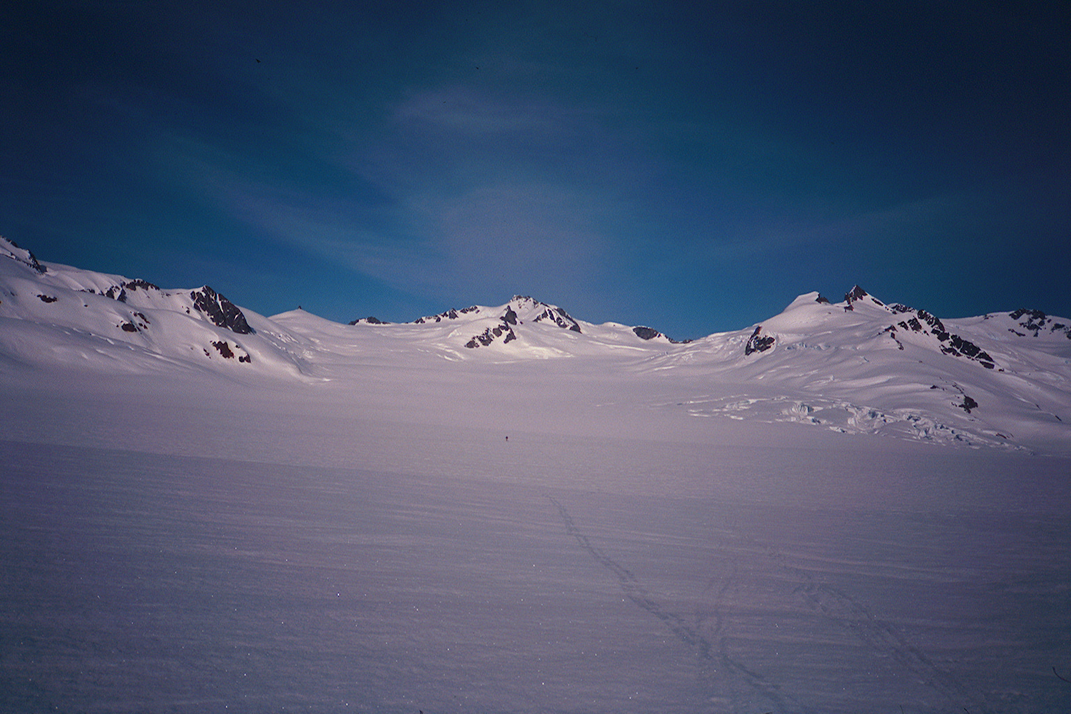 No more snow showers, high overcasts, and about 4" of new...enough to cover the rain runnels and hardpack. We skied down the Dais glacier to the Dais-Franklin junction and then up Regal Dome, a 700m cruiser that extended up towards the NW ridge of Wadd. We spend the day skiing two laps on the Dome with no other parties in sight. Nice to see just our tracks on a mountain. Regal Dome would be a great spot to hit early in a trip up there cause of the views of all the rest of the surrounding terrain.