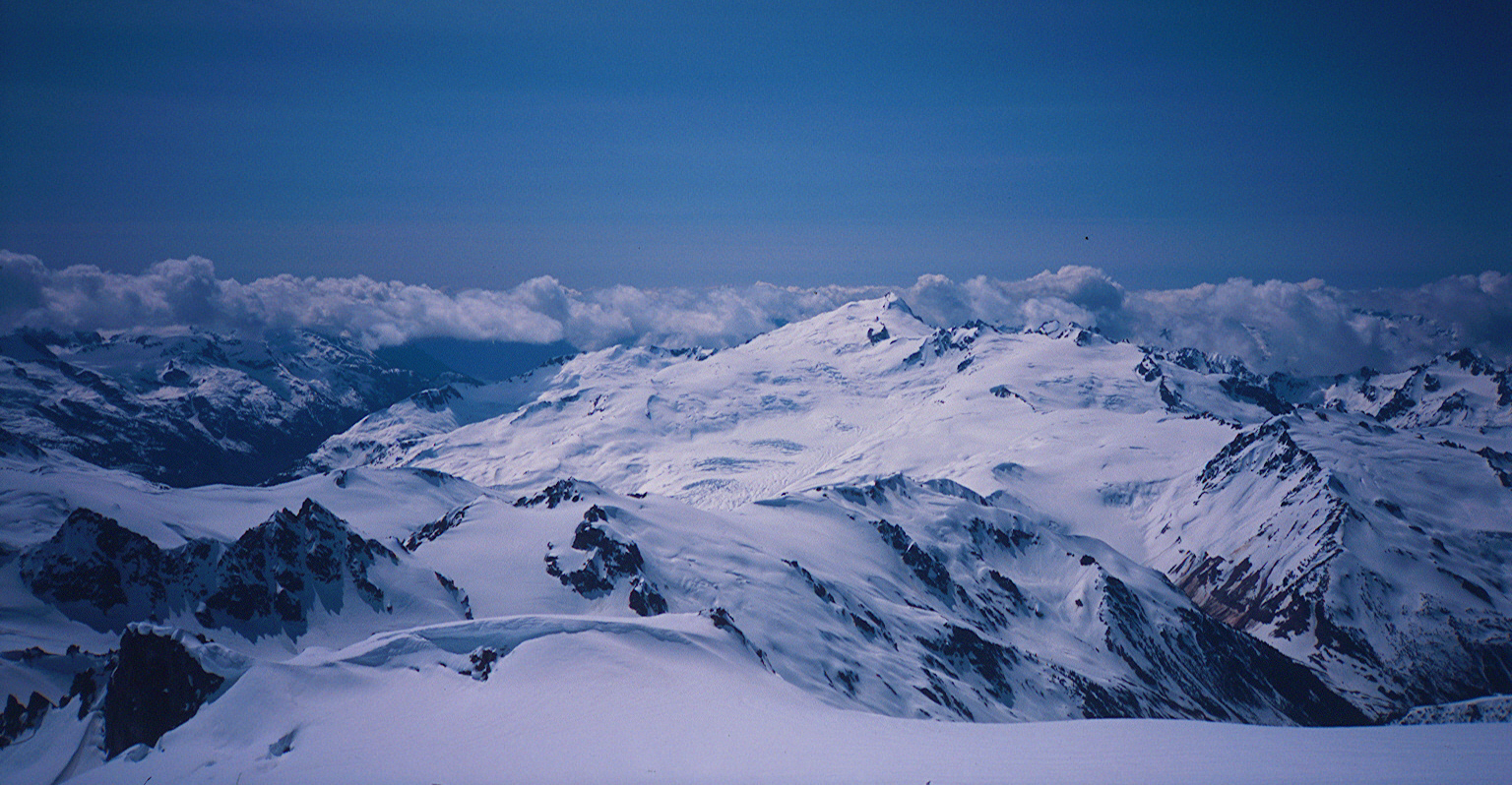 Mostly sunny weather so we were up early and started the five mile slog up the Finality glacier to Mt.Finality. Easy skinning all the way to the summit, took about five hours from our camp. We all agreed this was our favorite viewpoint of the trip...all the peaks we'd played on could be seen, and the rather remote Mt.Jubilee further west looked like a great (albeit remote) destination. I got a kick that we could once again see tidewater from a peak, this time the Knight Inlet was visible in the valley bottom out west. Finality also rests on the edge of the Waddington range and we could see deep green valleys just a couple miles away.