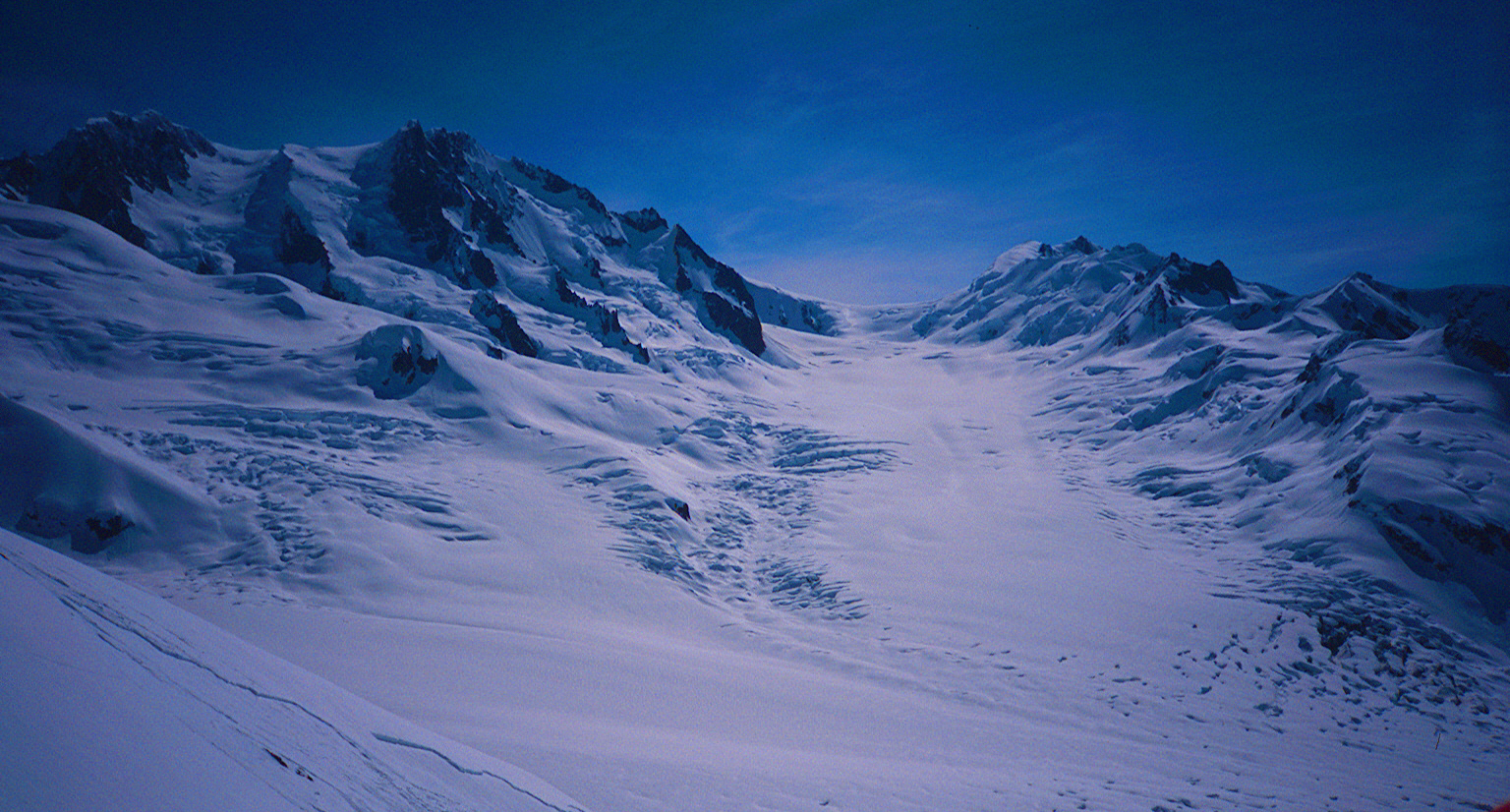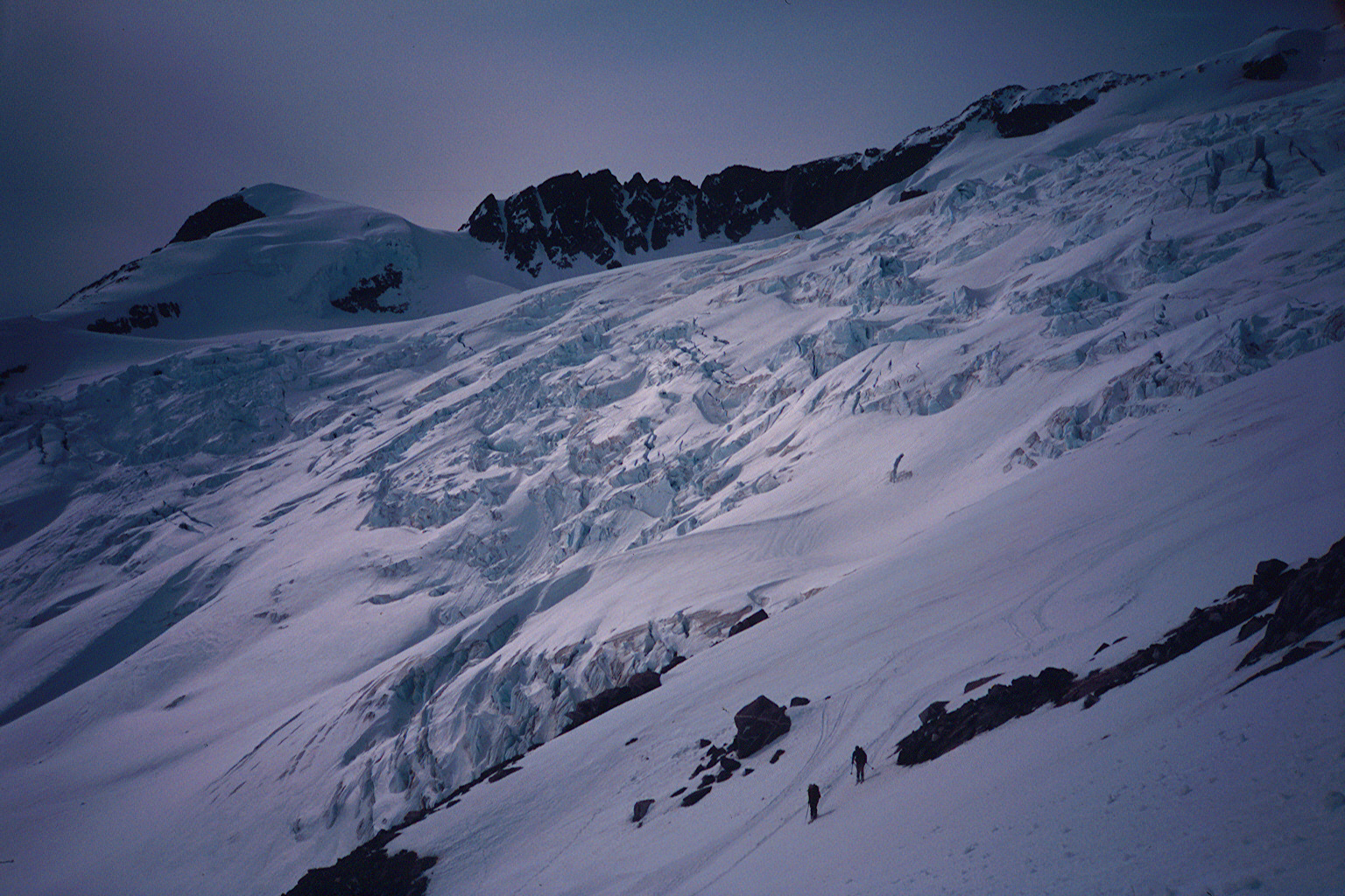 Broke camp early and headed back for our cache on the Dais glacier. We wanted to get up and over Jester Col before the slope turned into an avy hazard. We were back at the 'basecamp' my late morning and checked the weather again (first trip with a sat. phone...man are they handy). Looked like we'd have good weather on Friday then it was going to get stormy, so we figured we should try to get in the climb of Waddington before the snow started. We packed our day packs and set the alarms for 3:30am.