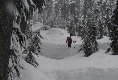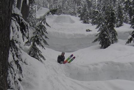 We arrived at about 11AM to 34 degrees and heavy snow. There was about 4 inches of heavy fresh snow below and abou 6 inches of lighter snow up in Pineapple Basin. Nice skinning out the lake and up through No Fog.