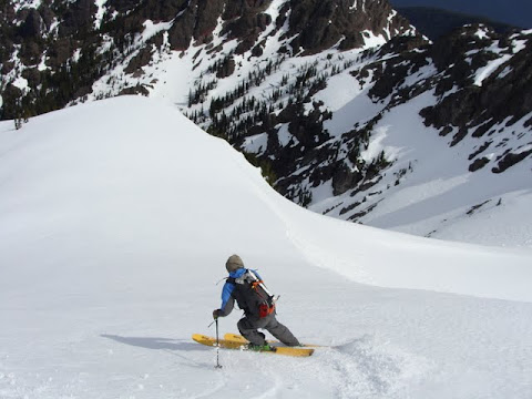 The northern bowl offered over 2K of descent with the option to come out onto an unnamed cole just NE of where we stood with another 2K descent into the basin north of Klahane. The eastern couloirs offered some tight turns but shorter runs. We opted for the longer adventure and descents. We then skirted around the S face of Angeles' East summit and found a nice point in the middle of the ridge between the E and W summits.