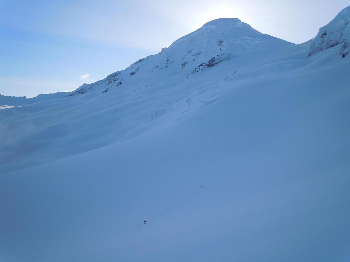 Reaching the summit crater clouds were threatening to take away the visibility we had so we decided best not to push on to Grant Peak call it good. The ski down Deming was creamy smooth and the Coleman had blower powder. Our descent took all but 10 minutes to reach Heliotrope as were were racing the clouds. As we reached Heliotrope the clouds began to lower taking away visibility for about 1000', but following our skin track was surprisingly fun. The ski out Heliotrope was had great coverage and was over before we knew it.