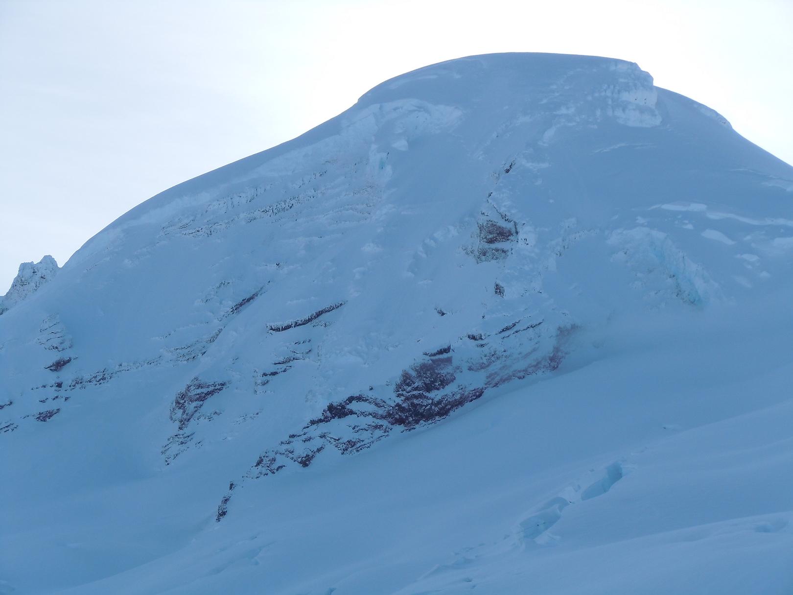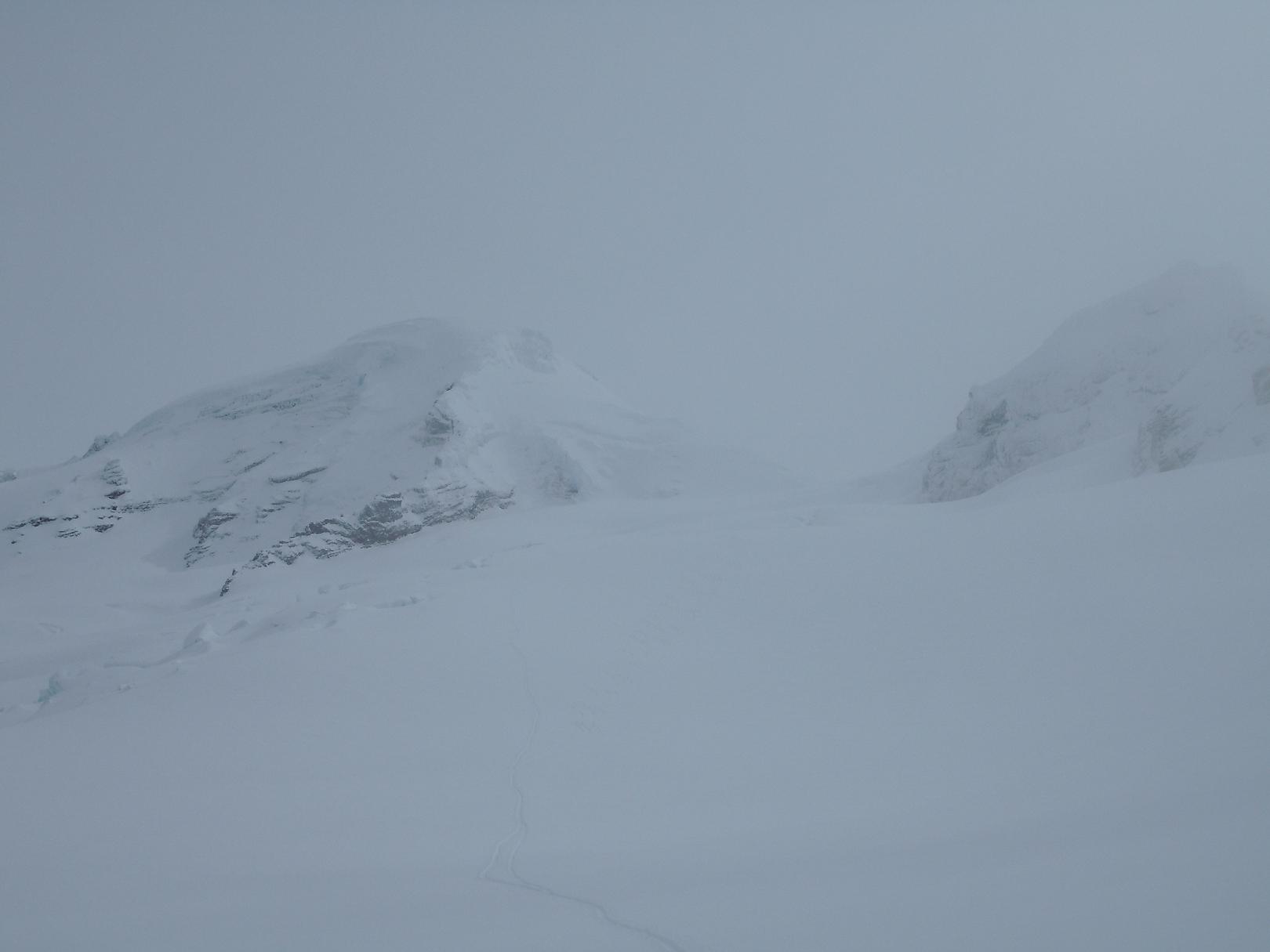 Our expectations were low, but hopes high as we headed up Heliotrope trail at 3:30am with moderate snowfalling. Reaching the base of Heliotrope the fog had not lifted so we patiently waited in the trees for daylight with hopes the fog would lift and we would get the clearing we needed to safely climb. Our patience paid off and soon the fog was lifting and Baker was coming into view!