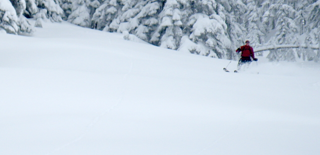 Thanks again for the great uptracks - Susan and Charlie are monsters! After the brief meeting at the parking area and watching you sail into the distance ahead of us, we could sense you but not see you for the rest of the day . ;D By the way, we sniffed out a route on a decent chunk of the lower 1K that was primarily old open forest, and the crunch factor was moderated down there thanks to the mush factor, making for another pretty fun run to cap off the day! No knee twisters in there...