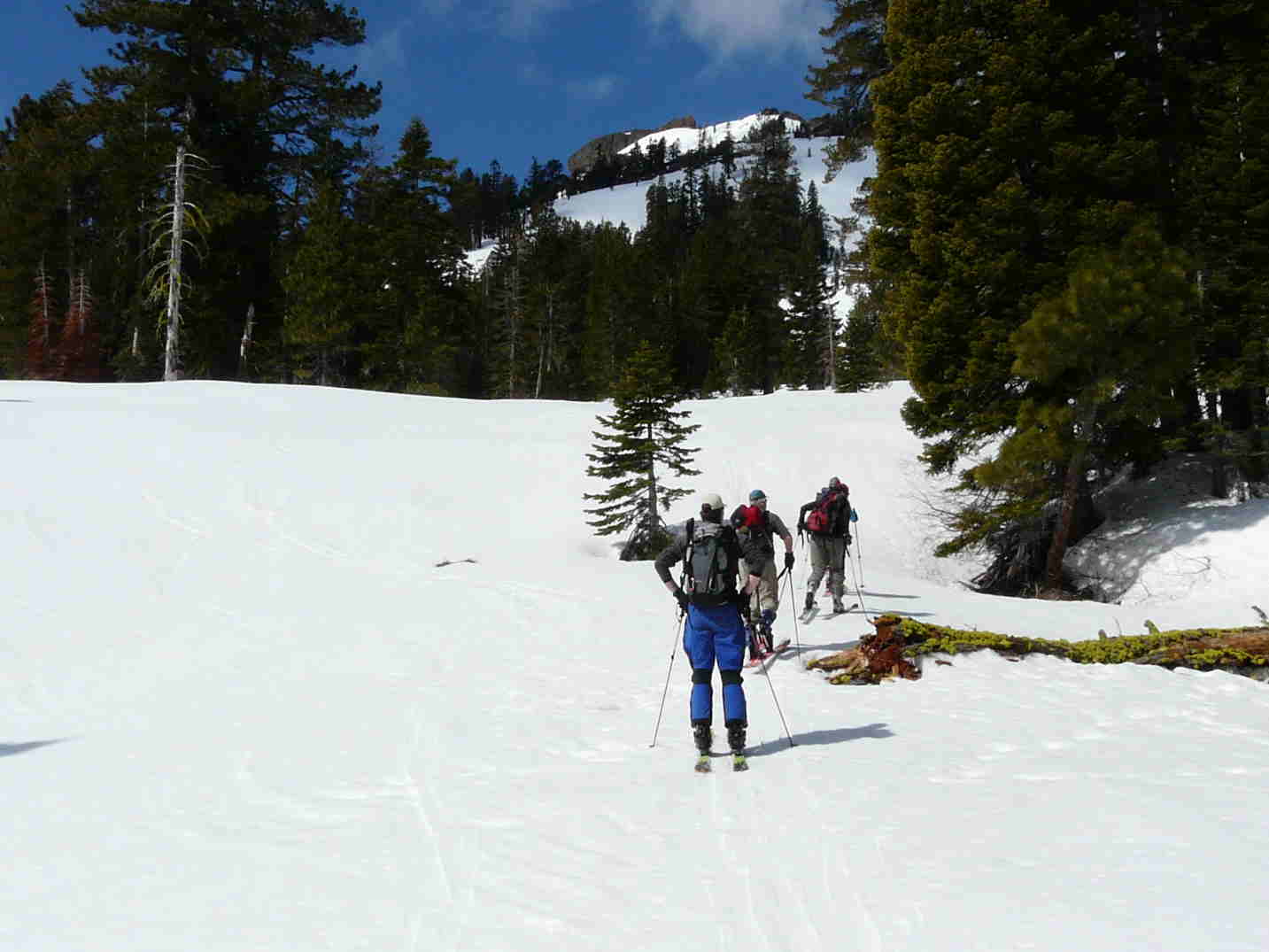 We met the Sierra Club backcountry skiers again for a shorter tour in the northwest area of Lake Tahoe near the Alpine Meadows ski area. One of the group leaders has a home in Ward Canyon which served as the starting point for our tour. Ward Canyon is at the backside of Alpine Meadows where the Sherwood lift is located. Although it was another sunny day, "breezy" conditions were forecasted and we wanted southeast terrain to ascend and descend. If you've ridden the Sherwood lift and looked to climbers left, you can see Grouse Rock along the ridgeline and further out the Twin Peaks. It's a long, long distance along the ridgeline to reach Twin Peaks. The fastest approach there is to ascend through Ward Canyon, but all of the property is privately held and parking is a problem. Unless you have a new friend that lives there. ;D The approach we followed was to descend about 400vf, cross Gstadt creek on one of the few bridges and then ascend the valley bottom until you locate a line through the old growth trees up to the ridgeline. The terrain is ideal for a spring tour with trees to provide shade for the ascent, ramps to access steep corn rollovers and small cliff bands for those who desire air time. It was tempting to continue towards Twin Peaks and the line that is clearly visible from the Sherwood lift, but after the long day yesterday at Maggies the climb to Grouse Rock was sufficient. It was another Sierra corn descent that ended way too soon