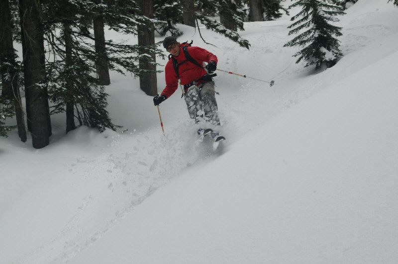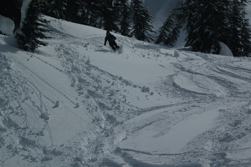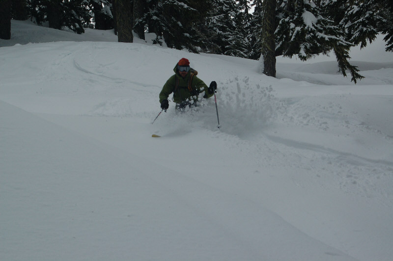 Headed out with Skip, Jason, and Hank in search of the fluffy goods and were not disappointed, and in fact were a bit surprised that the pow exceeded expectations. Snow on the 2nd run in the early afternoon was noticeably heavier in sun-exposed areas, but still quite fun (some face shots in the shade), followed by unexpectedly pleasant skiing on a solar aspect (SE-facing) on the way out (shallow mush overlying a firm base).