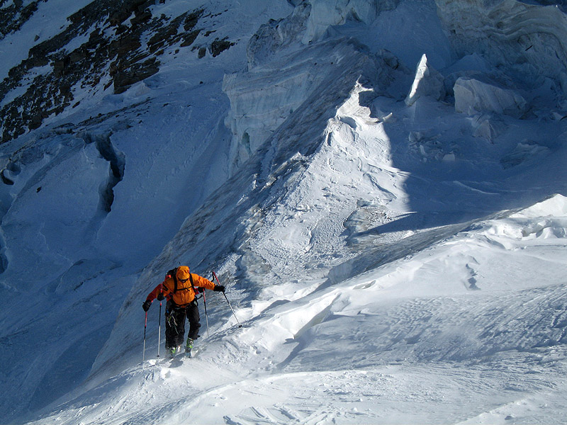 We took a slightly protected route up the lower mountain to stay out of the wind, then joined the rest of the skiers on the main route through the heavily glaciated upper portion. Topped out at the col @ 3,600 meters, then made an aborted attempt at the 4,000 meter summit but turned back in 60-70 mph winds and sub-zero temperatures, and due to the fact that we didn't have sufficient ice protection with us. Pretty much everyone in our party suffered frostbite on some part of their faces - so much for spring ski touring in Italy!