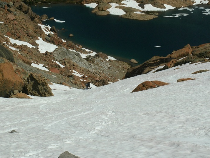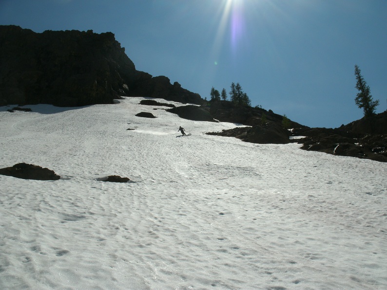On Monday my wife and I climbed the fun popular route on Ingalls Peak and what did we find between the climb and the lake below? 1000' of continuous boot skiing all the way to the lake shore. So of course I played hooky from work (again) on Thursday and went back to ski. Dan and I skied 5 runs in the headlight basin area. We saw one other set of tracks that looked a week old. First three runs were on the slope between The base of the climbing route (South ridge of North Peak) and the lake. Super fun. We actually skied right to the water. On the way back to the pass, we kept our boots on so we could ski the short (400') pitches above the trail. We had enough juice for two runs there. The surface has a sun-cupped appearance, but feels smooth. The corn by noon was 4-5" deep and skied great. Good booting too. The snow stops conveniently AT the trail. Switched back to sneaks for the walk out (Ingalls Pass to Esmerelda Basin TH). Very good skiing for the price of a 3 mile approach. Not bad for August! Left the car at 8:30 a.m. and back to the TH at 4 p.m.