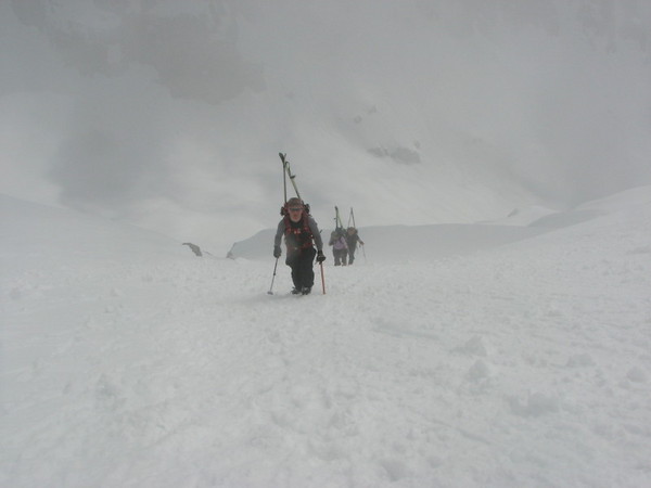 At the top of the couloir I traversed over onto the hanging snowfield where the snow became thicker and more textured than below. Steeper too. After some discussion it was decided that Christy ought to down climb to a safe zone. Josh went with her. Jason went with me.