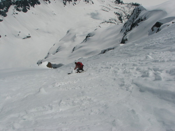 We decided to ski from the high point on the ridge where the snow looked to be smoothest and most stable. It meant that wed need to traverse underneath large cornices at some point, but wed be on skis. Few things get the heart pumping like steep turns with exposure. I made 4 or 5 turns and watched the wet slide Id created pour over the cliffs below. I was hungry at the time and made the mental note that the sliding snow looked like pancake batter. I made a few more turns then got sketched and asked Jason to take over for a bit. Fatboynomore took charge and lead the traverse under the cornices.