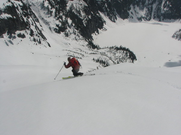 At the lake there were some low lying clouds which kept us from seeing the line I wanted to ski, but I had the route memorized and wasnt too concerned. I made a bee line for the ramp thru Columbias lower cliffs that Id scoped out from Kyes.