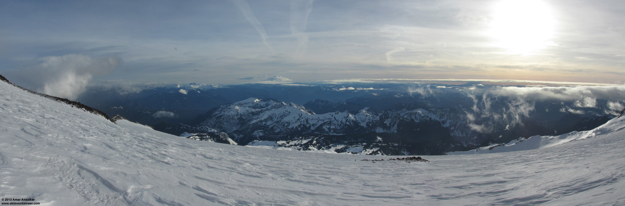 Four-shot panorama of the Muir Snowfield with Mounts Adams and Saint Helens in the distance, December 29.