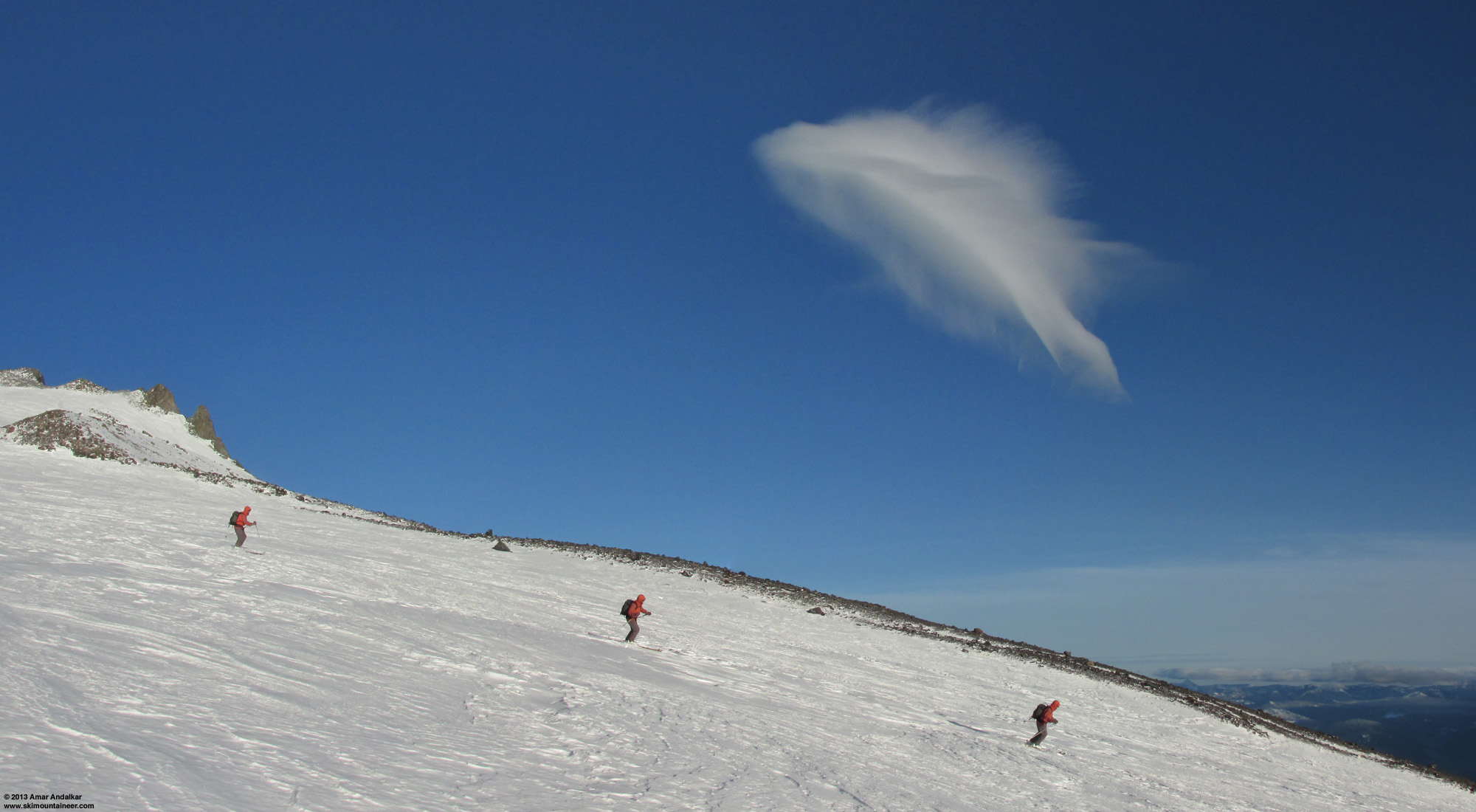 Three-shot panorama / multiple exposure of Kam skiing by an amazing feather-like lee wave cloud which formed east of the Muir Snowfield past Anvil Rock, December 25.