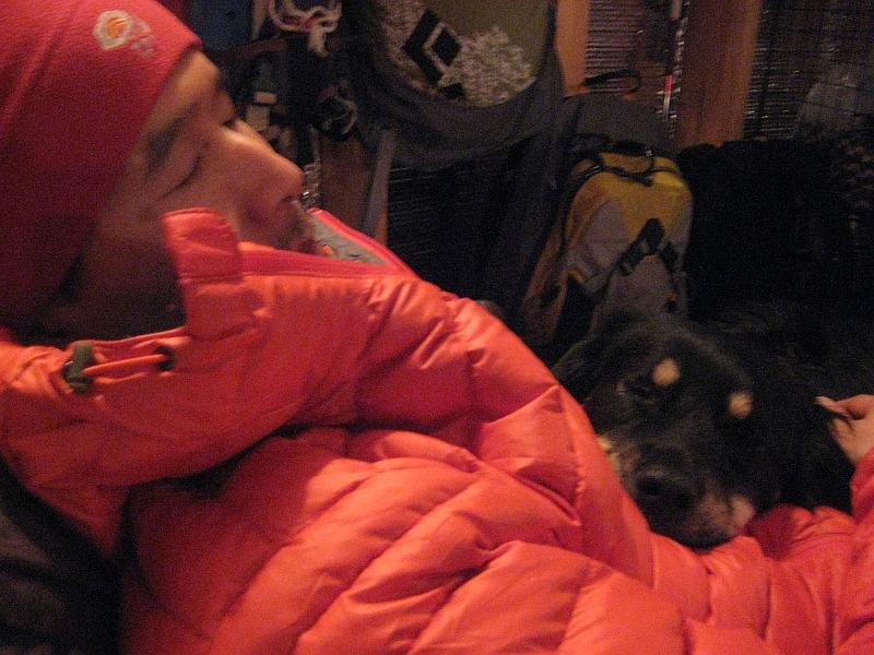 The low on Thursday night was -19 C and the daytime high didn't feel much warmer. We got through a brief avy scenario in plenty of time to head out for an afternoon tour -- the snow was fantastic, as expected, but there was a strong wind that made it tough to stay warm, so we kept moving until it was time to retire to the wood stove (which was earlier for me than for everyone else).