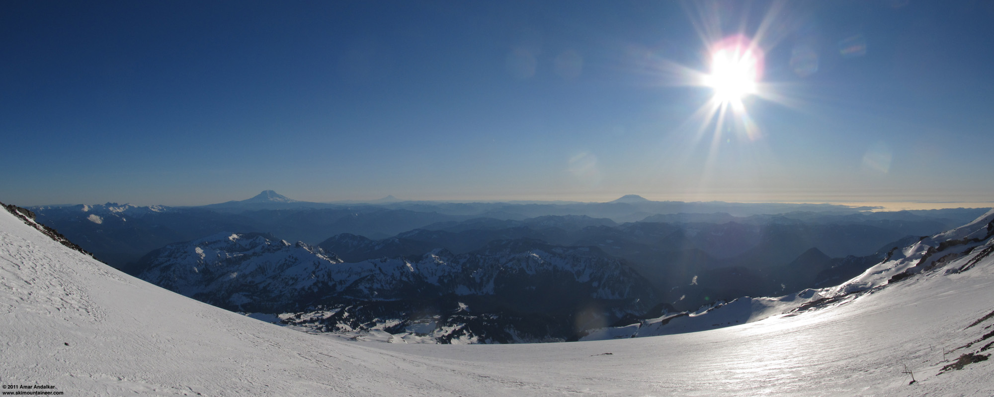 [size=small]Three-shot panorama looking south from Camp Muir, with Mounts Adams, Hood, and Saint Helens in the distance to the south.