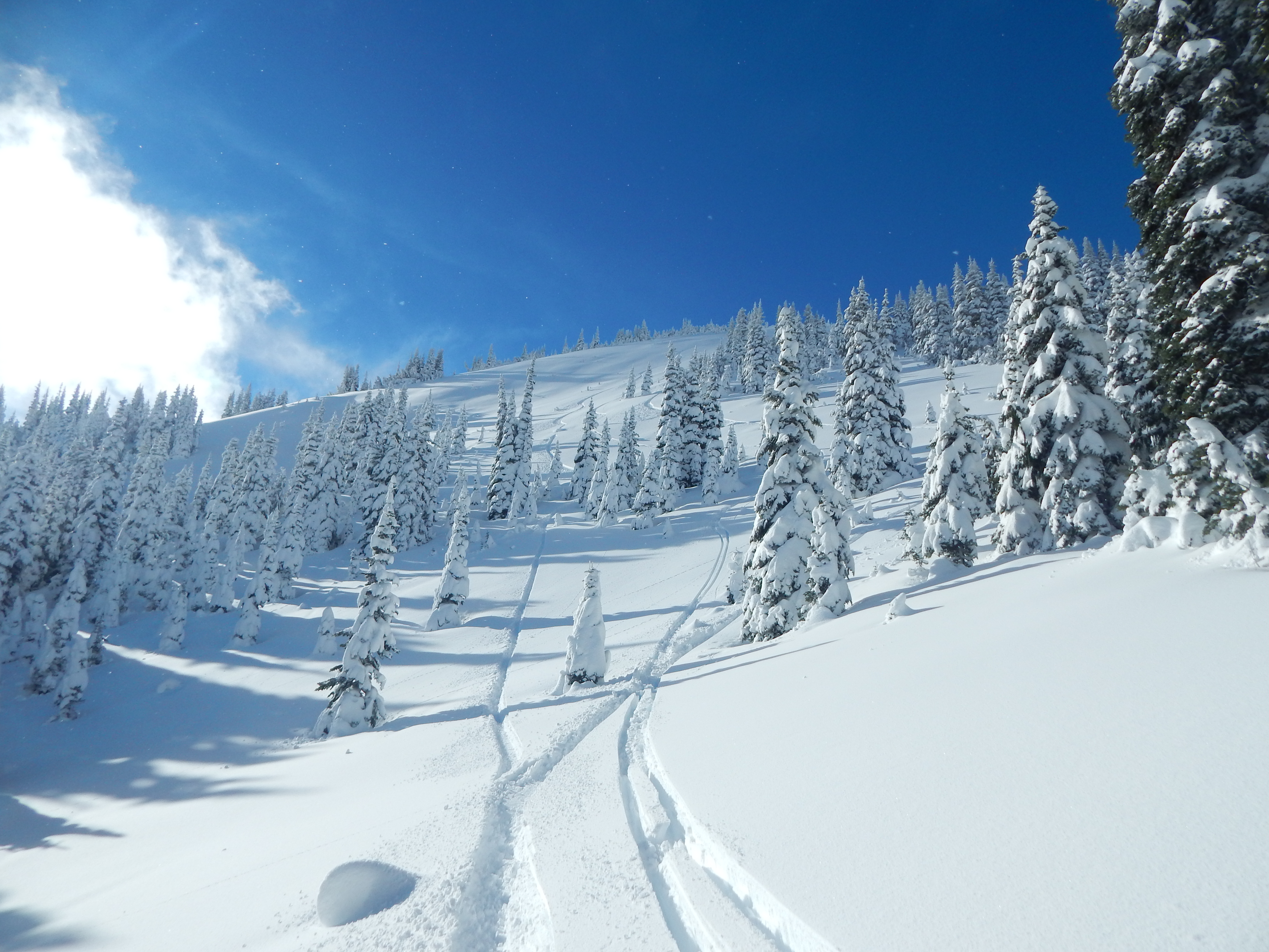 After regaining the ridge, we headed over to point 6479. On the way there, we got 2 small whoomphs while skinning just below the ridge at 6300 on a SE aspect. We hit the north slope cautiously knowing that it could have some wind loading, but nothing moved. Instead we got stellar powder turns in light snow that didnt have any solar impact. A great day out exploring areas around Bullion Basin!