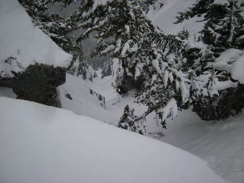 It was a fun day. Thanks for going. I should say last section is not skiable. After the hourglass S-turn you will need to bail out to skiers left. I found out the hard way ;D