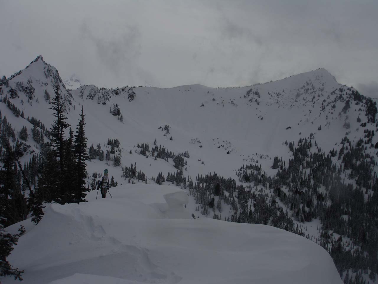After riding the glop on Saturday at Crystal I decided any chance of getting decent snow would have to be on North Facing Slopes so after watching the Quick Silver chair lift break down and helping repair it I was off into the BC. By the time we had ascended into the Alpine bowl the clouds had lifted and visability was great. When we summited I had a chance to view the North facing ridge of the Plate Lake basin and was suprised to see no slide activity.