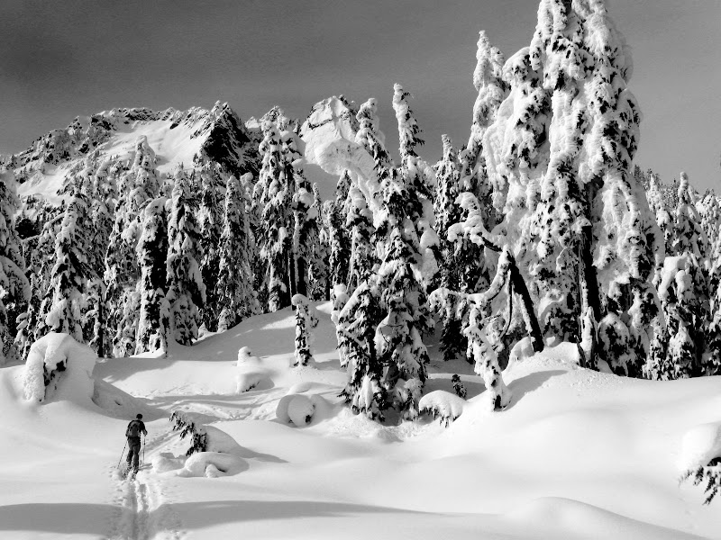 Snow elsewhere was better than expected - 2-4" of new on a soft skiable crust layer. Turns were pretty smooth even on the S facing stuff.