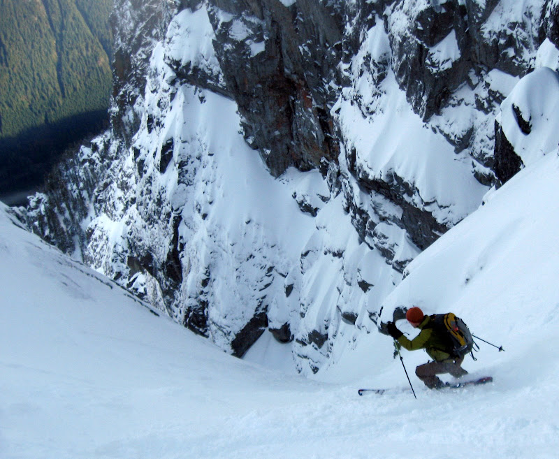 There were some small 'ankle biter' slabs near the top that we cut off the sidewalls. They were pretty small and would quickly break up and slough away. But it was interesting to think what we'd have been dealing with if it had snowed another 4-6 inches or had a little more wind deposition. On the plus side, that new snow and spindrift filled in all the tracks from the weekend's action. No moguls for us!