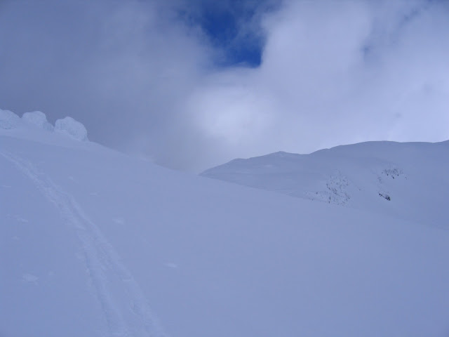 The snow conditions for the ski down were perfect, 4-6 inches of powder over a firm base. Unfortunately, the fog level had risen (did I mention the fog?) and we were reduced to side-slipping, carefully following our uptrack in flat light and minimal visibility.