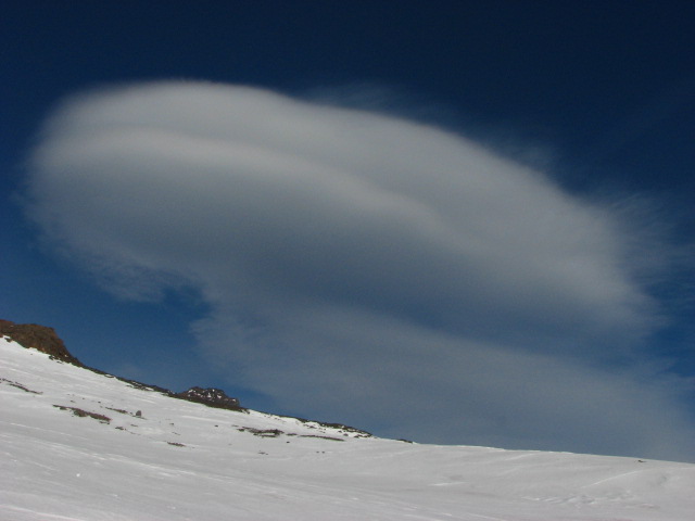 I accessed the glacier by skiing out to Cowlitz Rocks, a mellow but scenic tour up from Mazama Ridge. The skinning was fast on crust with a solid base below it. By the time I got to Cowlitz Rocks and started up the glacier, the snow low down on the glacier was just starting to soften up in the sun and warm temps. I stopped ascending at around 8,400 feet as the snow was not softening up any more due to a thin layer of high clouds and cold winds. The first 400-500 feet down wasn't very good skiing... little in the way of hard ice but lots of hard pack with a crusty surface, plenty of wind affected patches and no corn whatsoever. Down lower, however, was great, as the surface got much smoother and the snow corned up nicely as the day went on. The skiing was so good it was worth another 3 laps of the bottom 800-1000 feet down to the Cowlitz saddle or lower Paradise Glacier before the fast ski out.