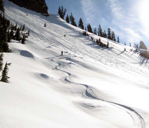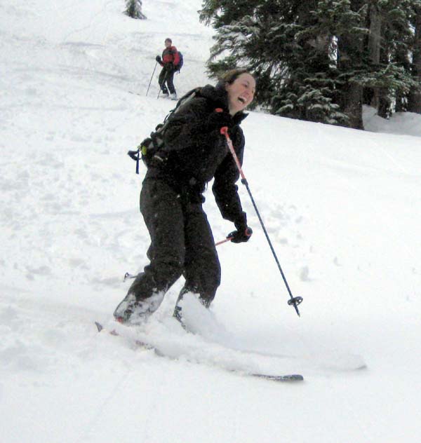 I spent the last 2 days skiing Baker backcountry with The Niece and The Gimp. Conditions are far better than I had hoped. There is almost none of the Snoqualmie death crust up north. With the 3-5" fresh overnight we found ski penetration 3-8" on the uptrack, pole penetration occasionally up to the handle. The new is heavy and dense down low but suprisingly light at 5000'. The new snow is bonding poorly in places to the surface and we saw numerous natural sluffs on the north facing steeps. We triggered the same sluffs occasionally while skiing but the volume of sliding snow is small. With clearing skies and colder temps around noon the snow seemed to be drying out some. It's starting to feel like winter...