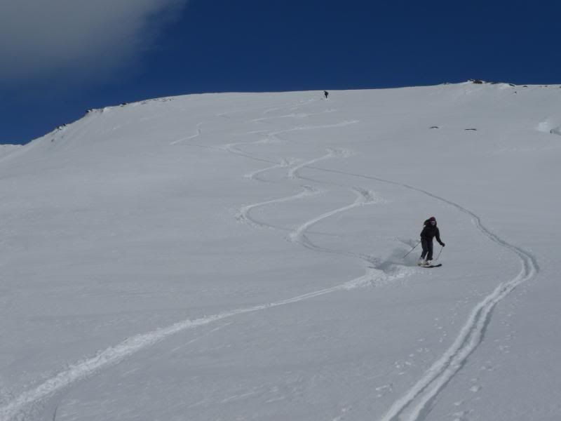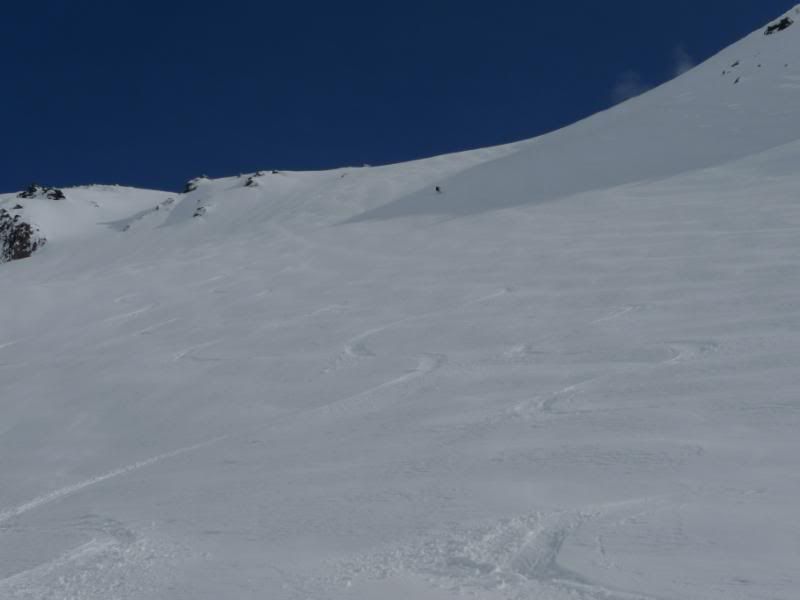 We skied the 800ft to where Pebble Creek meets the glacier, skinned back up and did another lap in a more narrow chute skiers right of first line as the clouds moved in the light went flat. Snow was great with some wind effect. We traversed and skinned out at Glacier Vista and joined the throngs battling breakable crust which was almost un-skiable back to the parking lot.