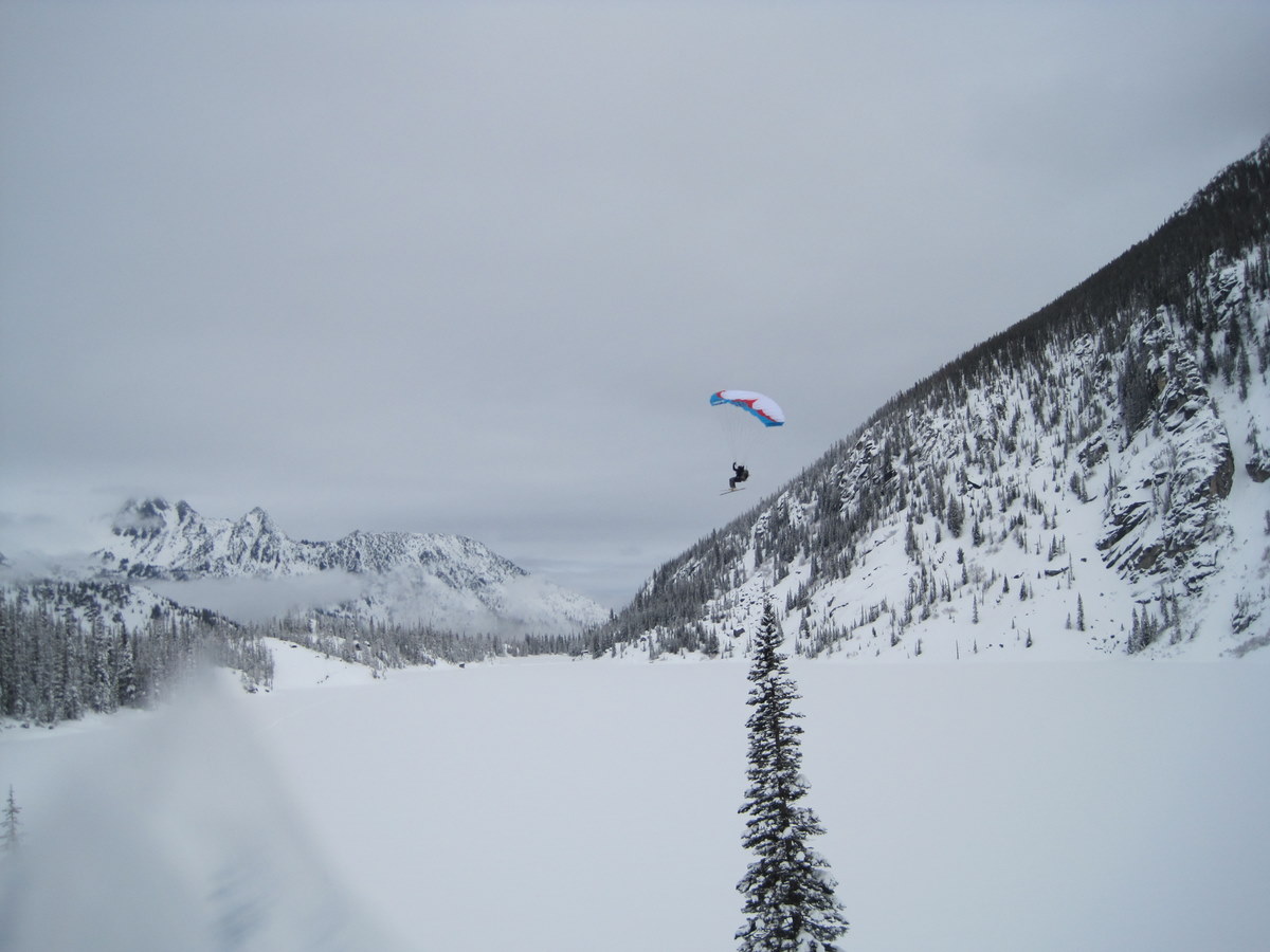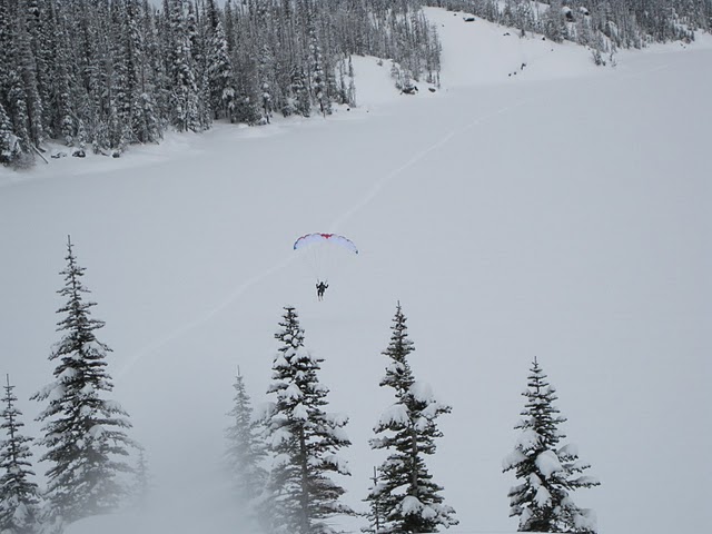 One of the other two skiers we saw up there was para-skiing, and ended up flying over our heads for a graceful landing on the lake. For how bad-ass that looked, I'm still not convinced it was worth passing up the freshie-fresh pow! Didn't catch any names as they were buzzing past, but maybe they'll chime in if they happen upon this TR.