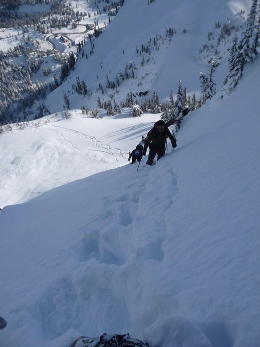Finally did Stoneman. I have looked at the line for years and always wanted to do it so the time seemed great with the high pressure sitting over us. We skied up over the top of Mazama bowl and down the east side traversing over to the base of Stoneman. We kicked steps and went up the chute so we would know the ski conditions. I kicked steps up skier's left of the center of the chute with the snow hitting me mid thigh to hip the whole way. The conditions on the left side were quite solid but when approaching the center of the chute the snow pack thinned out to about 6 to 8 inches over hard crust. At the top the standard route coming down and traversing skier's left into the chute was extremely steep and committing.