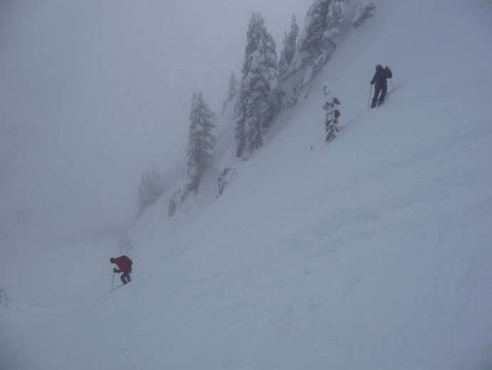 We were wanting to scout out other routes in the area from the top but as is my typical luck forecasts called for a sunny day as we ascend a cloud comes and sits on top of us so when we reach the top visibility is very limited. We waited a while but to no avail so we dropped in. We started with a ski cut at the top which released a slide over the hard pack center area but the skier's right side (the side we came up) was solid all the way down.