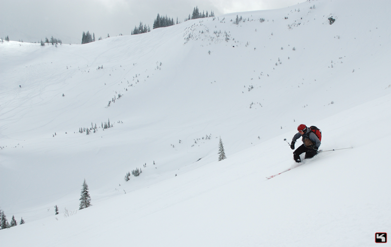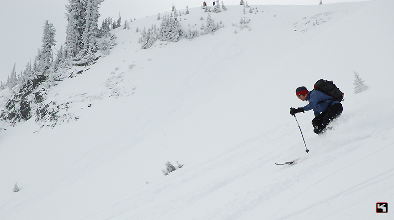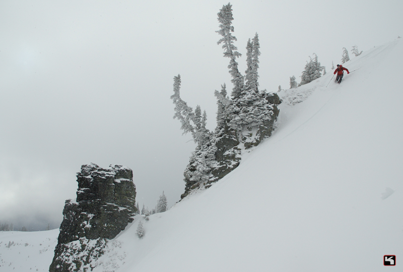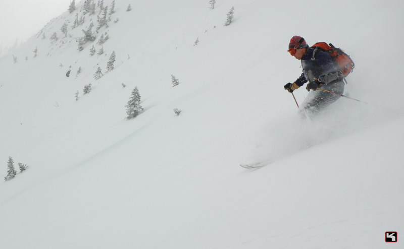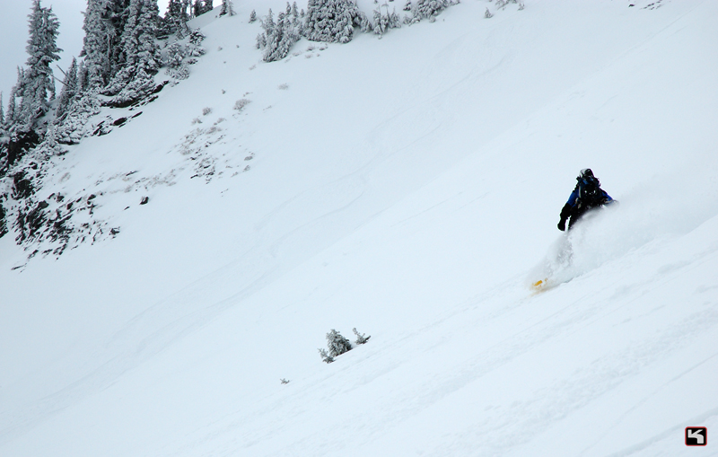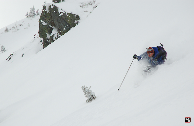 Next stop was the highlight of our day (well, ok, second highlight of our day), White's Knuckle, a little 40 degree chute above the 30 degree run of puffy knolls we call "Pillow Talk", all again, untracked until we got there. We accessed the bottom via "Y Not" as we had to boot it up White's Knuckle to make sure it was clear (it's hard to see the entire line from the top or the bottom and with the low snow pack we were not sure the line would go).