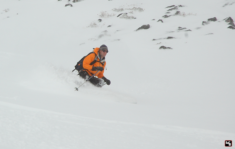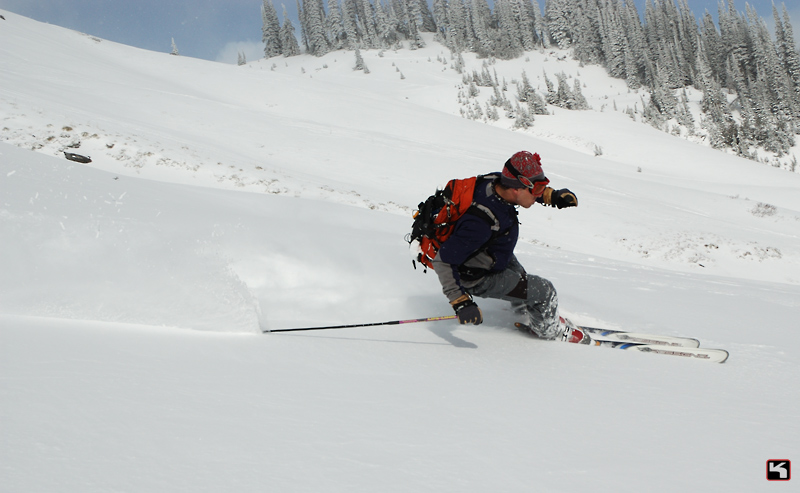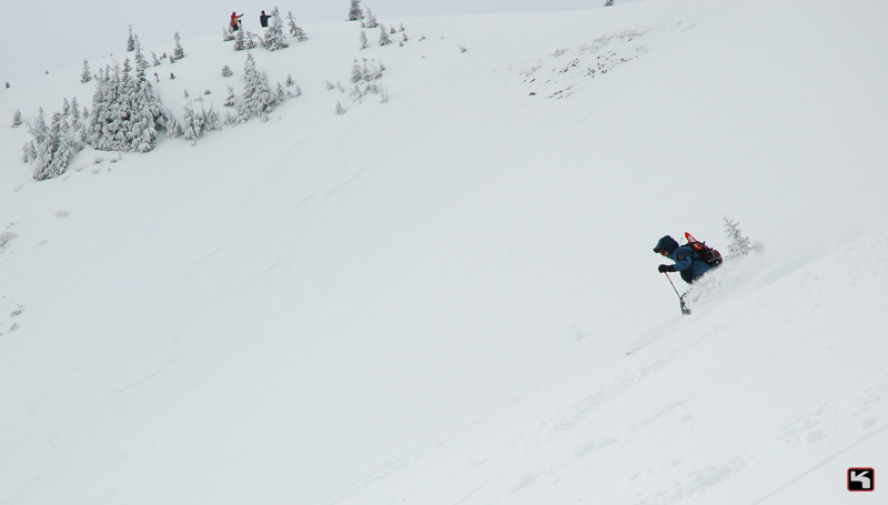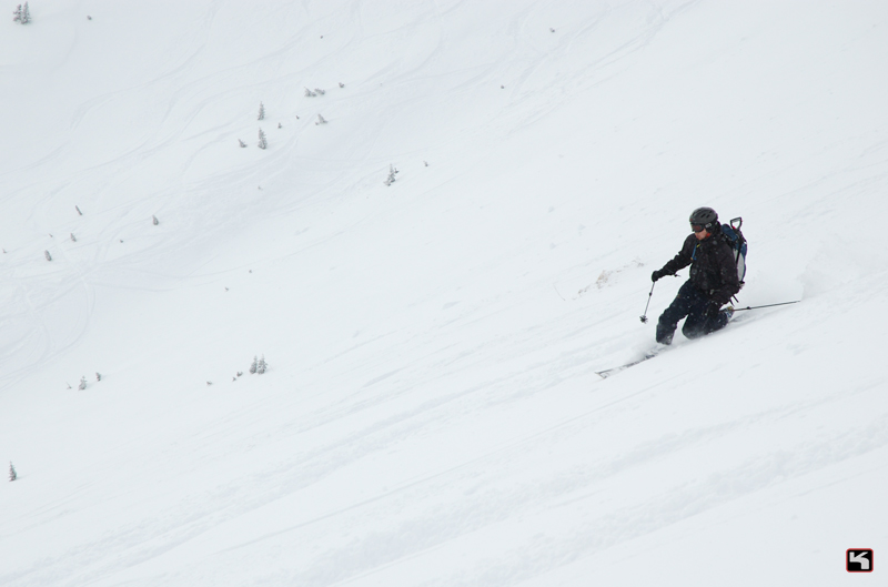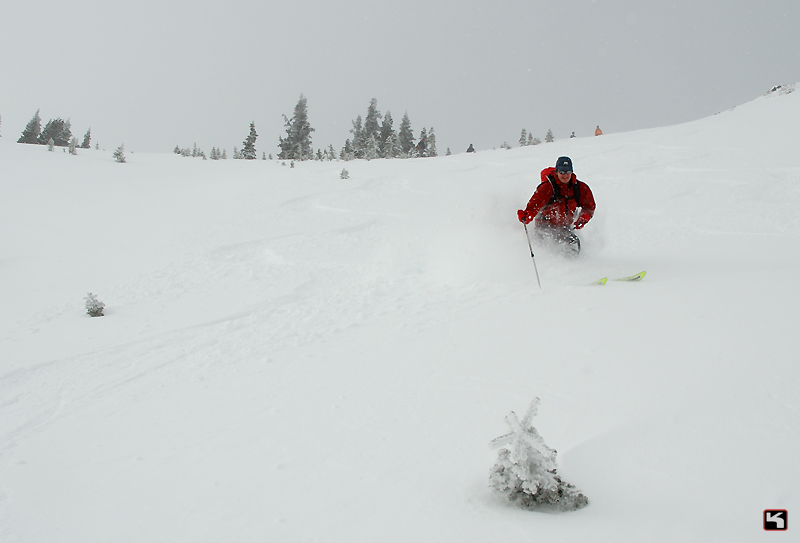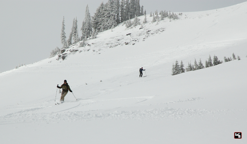As Geezer #4, I can attest that this trip had great: powder, slopes and company. For inquiring minds, I can provide one more data point for those studying which combination of skins and skis works best for downhill travel: one skin on and one skin off does not work well. Of course, it does add a little extra challenge...
