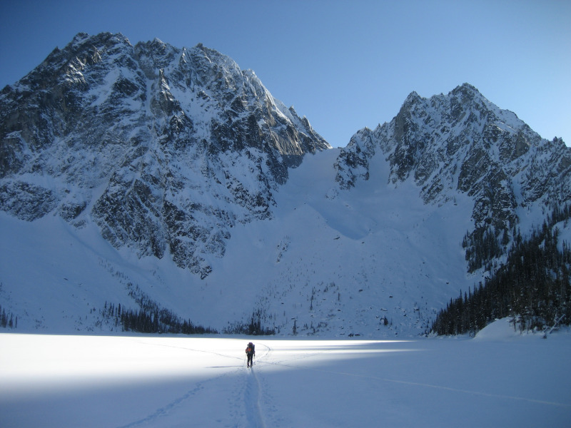 Today we left camp around 7:30 and started the grind up towards Aasgard Pass. We followed a skin track until about 6500ft, but the firm wind slab was getting too slippy so we racked the skis and booted the rest of the way to the top of the pass. We were unsure what the snow on the Snow Creek glacier would be like given that it gets morning sun, but we were very pleasantly surprised to see two sets of recent, great-looking tracks coming down it so we knew it would be good! There was a nice skin track already laid up the Snow Creek glacier and the south side all the way to the summit (thank you whoever put that in!) so we were able to make short work of the final leg. We topped out around 11:30 and soaked in the views. Started down around noon and were, again, pleasantly surprised that the snow on the south face of Dragontail wasn't too crusty or overcooked. We turned the corner and headed down the Snow Creek glacier to have our suspicions confirmed. The snow was ever so slightly wind-effected, but the turns were fun and fast. Sadly, the windslab we had booted up to get to the top of Aasgard pass had not magically truned into blower powder, but at least it was supportive so we carefully picked our way down to about 6200 where the angle eased off and the snow DID magically turn in to powder! Got about 700 feet of great snow back down to the lake.
