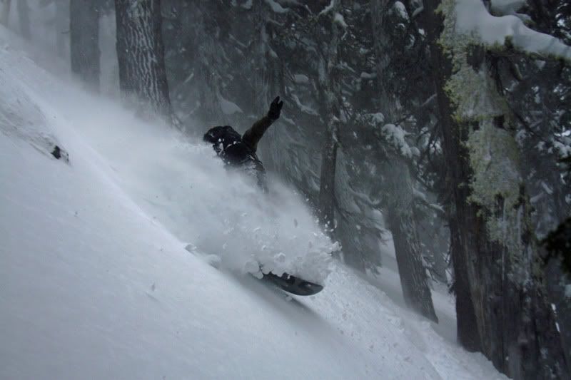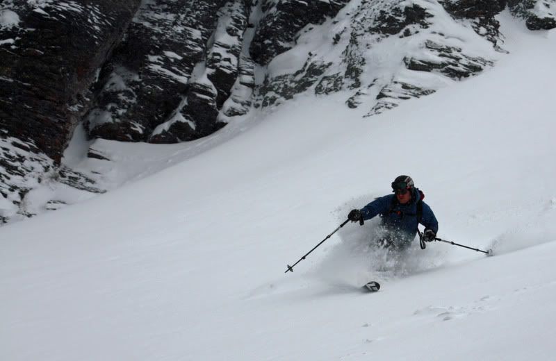 Soon after, we hit the slopes breaking trail looking forward to a great tree run. The area has every kind of terrain a backcountry enthusiast could ask for: steep tree runs, glades, cliffs, and wide open bowls. The first lap yielded prime conditions......deep deep powder! My best guess was that about 60-70 inches had fallen in the past week and a half, and it was still coming down hard, though it was windy.