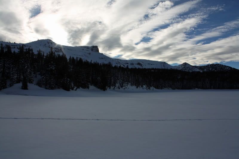 On Thursday morning, our last morning, we awoke to another 3 inches of fresh snow and were able to get one lap in before we had to leave. The snow quality that morning was excellent, and we probably had the best run of the trip. I can't wait to go back next year. Here's a parting shot of the rim from the lake......