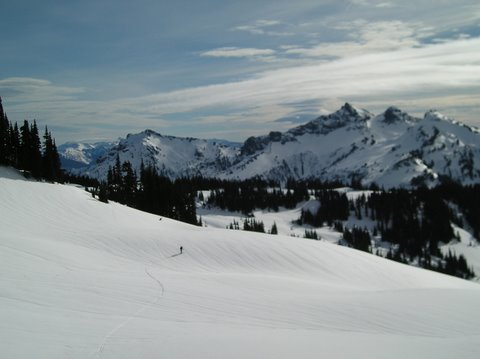 We skinned up past Alta Vista to the base of Pan Point and saw only one set of well covered tracks as evidence that someone else had been out. The sun was bright even through some high mixed clouds and was warming the top few inches to buttercream. St. Helens had a lazy steam or dust plume drifting above the rim and Adams was sporting a lenticular stack. Rainier had a stack of flapjacks to the SE of the peak. The summit was mostly in the clouds during the day.