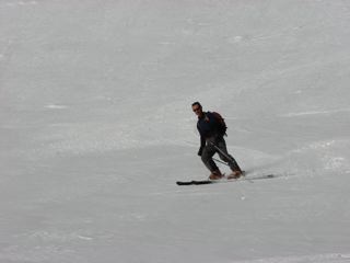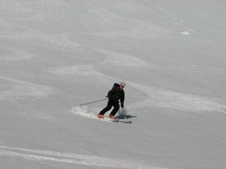 The descent back to the trail was not as bad as anticipated given the skinning in the morning. No corn, but the crust had softened up enough to make for nice turns, although the surface was a bit rough, perhaps from the remnants of old slides. Good turns all the way back to the trail.