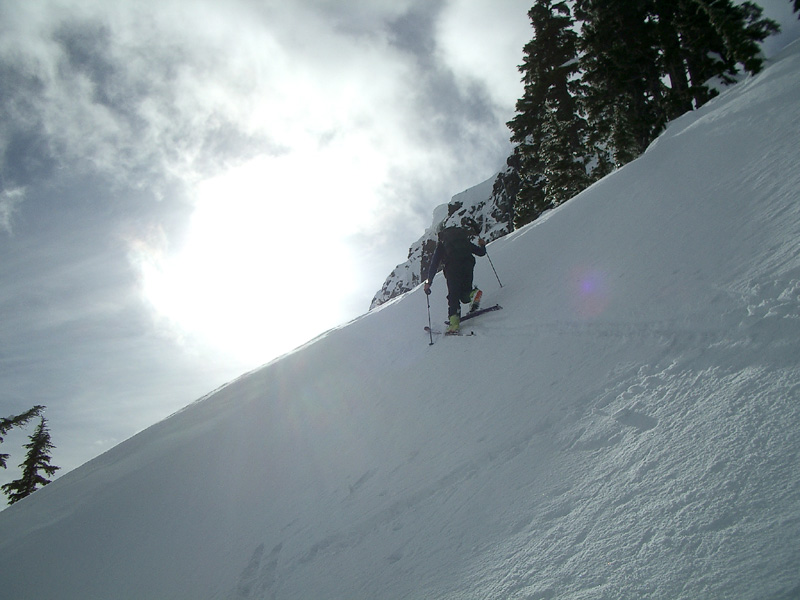 Someone had put in a skin track a day or so ago up from Snow Lake which we gratefully followed, to be rewarded with more crust skiing under Chair Peak (this time, traverses followed by kick turns)! Some of the worst skiing either of us has experienced, to be sure . . . recommend you stay away until it snows again.