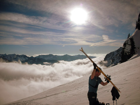 Sunday morning Mike and I skinned to Chair Peak summit bowl with some interesting route finding due to low visibility. Occasional glimpses of cliff bands and peaks alternated between confusing us and assisting us. Either way we found a beautiful morning above the clouds in the upper bowl below Chair Peak. We climbed the NE buttress which wound up taking the rest of the day, so didnt get much skiing in on the excellent snow still holding in the upper bowl. On the ridge wind was howling but it soon quieted down and became a perfect day with all the sun and views you could want. From the buttress ridge I saw three skiers below, descending towards Snow Lake. And from the whooping I thought I heard I imagined they were having a good time :)
